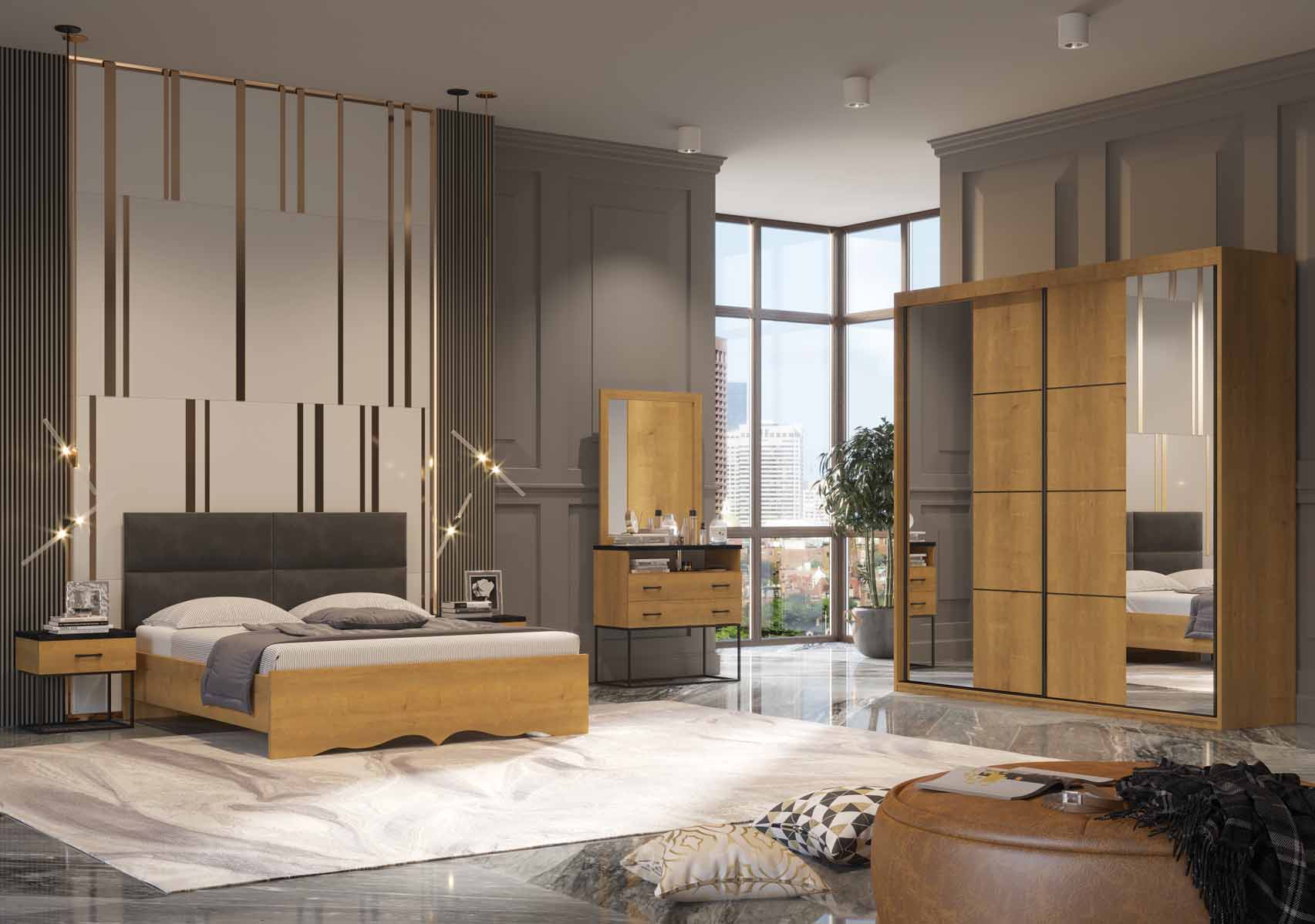חדר שינה קומפלט הכולל: מיטה, זוג שידות, קומודה ומראה (ללא המזנון המוצג)